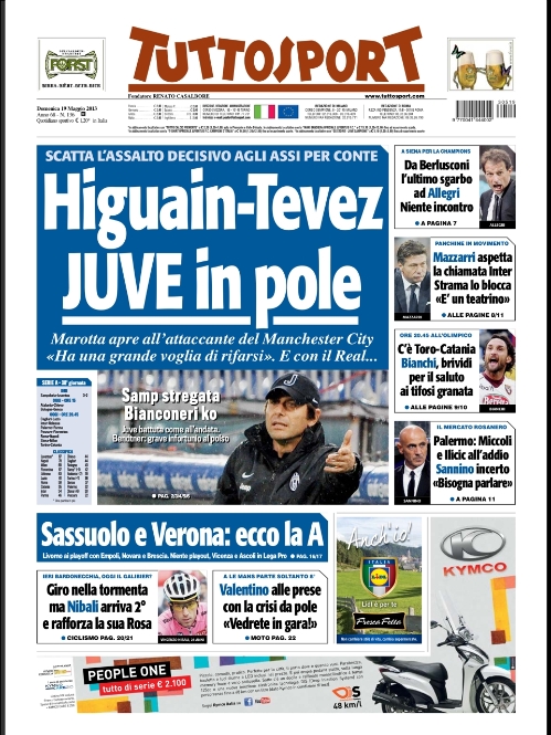 Al solito, si chiude sempre con il meglio, il “quotidiano sportivo” torinese. La Juve perde e fallisce l’obiettivo di battere tutte e 19 le squadre di A? Nessun problema! Si apre col mercato. E fa decisamente meglio del CorSport, indicando addirittura che la Juve è sia su Tevez che su Higuain. Ovviamente, anche la loro opinione su Berlusconi-Allegri non può mancare: viene definito “sgarbo” e, nelle pagine interne, fanno il nome di Donadoni.