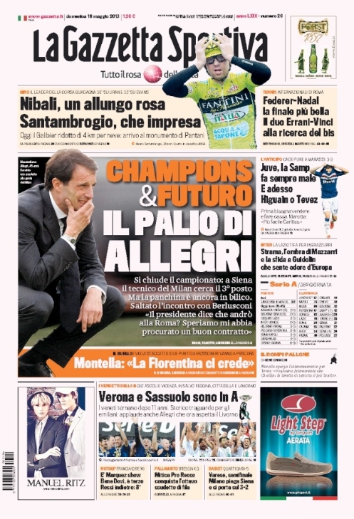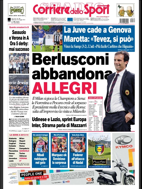Il CorSport è meno diplomatico ed apre con un bel “Berlusconi abbandona Allegri”, interpretando questa mancata visita come un placet per Allegri alla Roma. Lanciato, inoltre, il solito tormentone dell’estate: quale grande attaccante vestirà la maglia della Juve la prossima estate? Higuain o Tevez? Ricordando che la scorsa stagione, dopo aver leso le nostre parti intime per mesi con i vari Van Persie, Robben e Tevez, arrivò Bendtner, con un contorno di Anelka a gennaio. Fossi in Gilardino, mi preparerei a firmare.